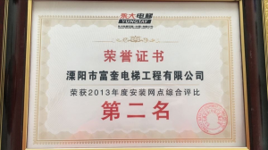 溧陽市富奎電梯工程有限公司 溧陽市富奎電梯工程有限公司是于二OO八年一月九日在原前身溧陽市電梯工程公司基礎(chǔ)上成立的,是專業(yè)從事電梯銷售安裝維修、保養(yǎng)的企業(yè)。是國家質(zhì)監(jiān)總局頒發(fā)的特種設(shè)備安裝、改造、維修A級(jí)安裝許可證單位。公司組織機(jī)構(gòu)實(shí)行總經(jīng)理負(fù)責(zé)制,公司下設(shè)管理部、銷售部、安裝維修部、質(zhì)安部、財(cái)務(wù)部,公司另外設(shè)十二個(gè)分公司:四川分公司、江蘇分公司、上海分公司、浙江分公司、湖南分公司、遼寧分公司、山東分...